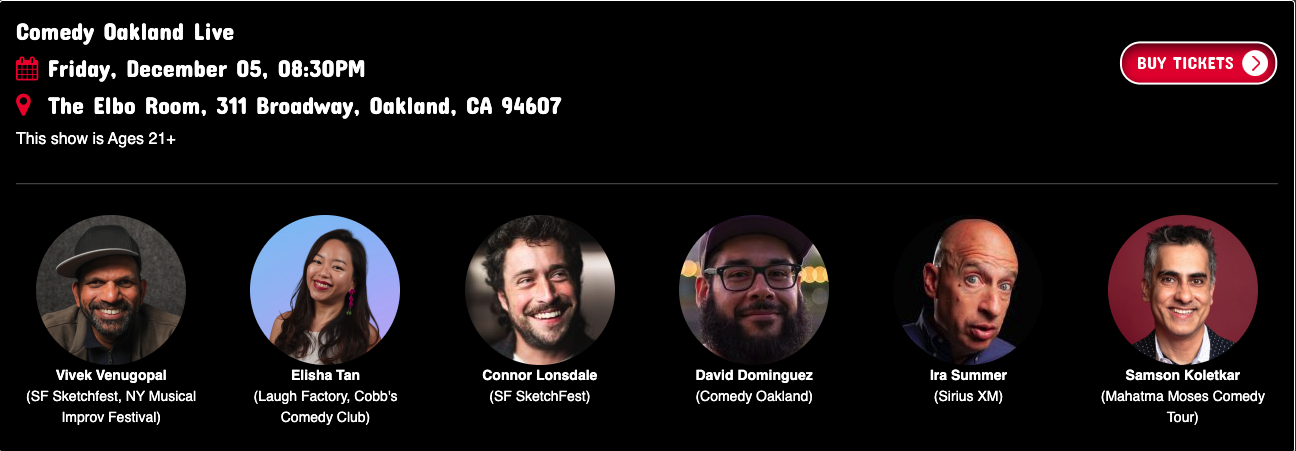 Comedy Oakland - Featuring the best comedians from the Bay Area and beyond, with appearances on Comedy Central, Netflix, Late Night talk shows, and performances on every habitable continent, we bring you a hilarious lineup of comedians every week! Tix here!